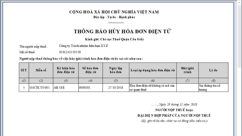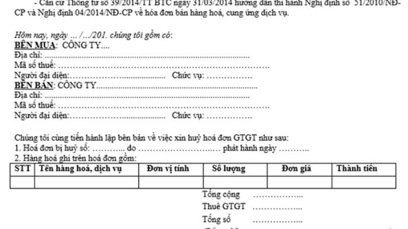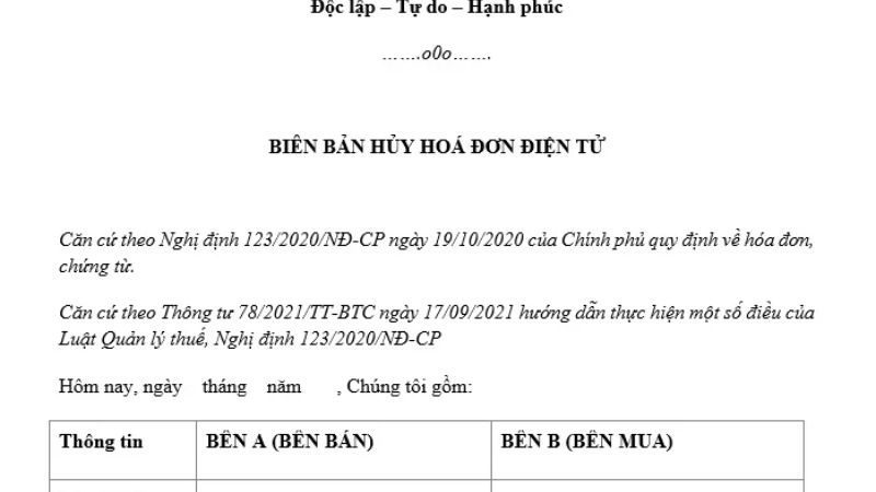 - Biên bản hủy hóa đơn điện tử (lập ở Bước 2): Tài liệu này doanh nghiệp tự lập và lưu tại đơn vị, nhưng có thể được cơ quan thuế yêu cầu cung cấp khi cần thiết.